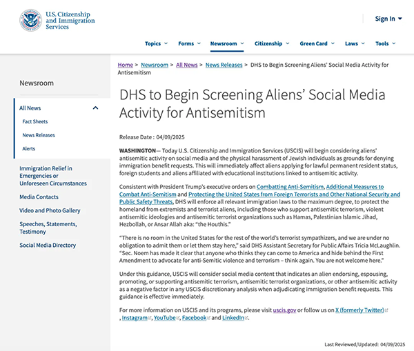 美国移民局(USCIS)4月9日宣布,将开始审查外国人的社交媒体言论,若有参与支持恐怖主义等活动的证据,将作为拒绝申请的依据。