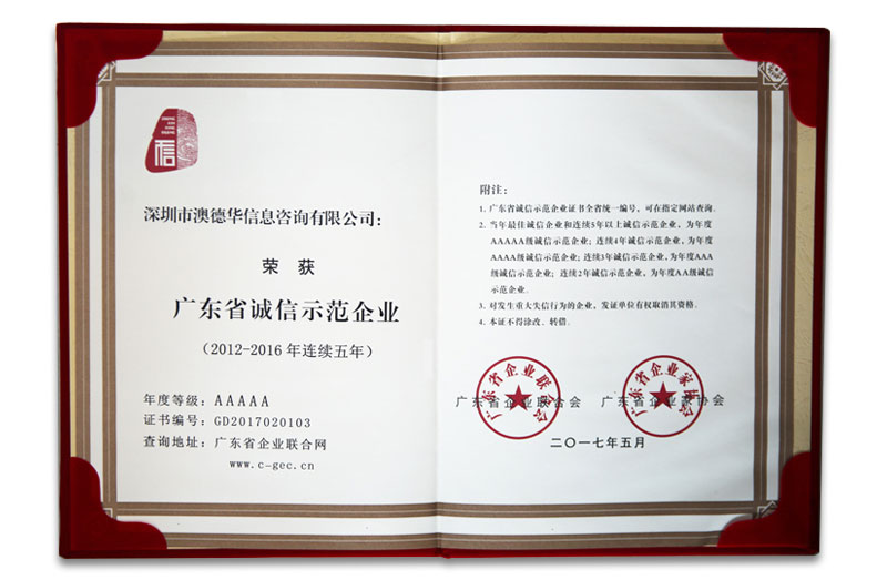 澳德华集团连续5年(2012-2016)荣获广东省诚...