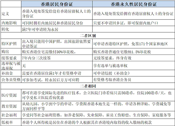 香港居民身份证和香港永久性居民身份证的主要区别在于,持有香港永久性居民身份证的人有权申请香港特区护照。然而,无论是香港居民还是香港永久居民,他们享受的福利基本上是相同的。只要连续在香港居住满7年,就可以申请成为永久居留公民,并申请香港特区护照。至于这三个证件的申领顺序,首先是“香港身份证”,然后是“香港永久居民身份证”,最后是“香港特区护照”。通过香港入境事务处颁布的吸引人才政策,包括香港高端人才通行证计划(“高才通”)、优秀人才入境计划(“优才计划”)、输入内地人才计划、科技人才入境计划、非本地毕业生留港/回港就业安排等,申请人及其受养人获批后办理的是“香港居民身份证”。香港居民身份证是香港临时居民身份证明,并非香港永久性居民身份证,为有时间限制的逗留,没有香港居留权。优才获批后一般首次入境可获准在港逗留36个月而不受其他逗留条件限制。36个月到期前申请延期逗留如获批准,申请人通常会以3+2年的模式获准在港逗留而不受其他逗留条件限制,即可延期两次逗留期限,一次36个月,一次24个月。这就是大家理解的优才3+3+2年续签,高才通的续签是2+3+2年。持有香港居民身份证,在教育、医疗、社会福利等方面享有的和永久居民基本相同,包括子女享15年免费公立义务教育、同等公立医院看病优惠、同样可参保香港养老、子女在港出生即可直接取得香港永居身份证、享受个人所得税低税率、通过联招低分上香港本地大学等福利。香港永久性居民身份证(Hong Kong Permanent Identity Card)是由中华人民共和国香港特别行政区政府入境事务处签发给拥有香港居留权人士的身份证,是香港居民的主要身份证明文件。根据香港法例第115章《入境条例》第2A条,香港永久性居民具有以下权利:- 不会被施加任何逗留在香港的条件,而任何向他施加的逗留条件,均属无效;