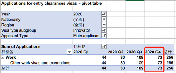 首先我们先来看下投资移民的数据:2020年第四季度,投资移民中国大陆递交数量为13人,获签9人,中国香港递交8人,获签10人。 虽然大家也很关心首席代表签证的数据情况,但是首席代表签证是隶属于Non-PBS work类别下的Other permit free employment下的一个子类别,并没有单独统计,这个Other permit free employment类别的签证申请和过签情况是中国申请者共50人,获批36人(含上个季度): 这个签证类别还至少包括了首席代表签证、海外新闻工作者、海外政府雇员等其他签证,因此以上数据仅供参考,并不能准确的描述首席代表签证过签情况。 下面我们重点为大家解析英国移民局针对创新移民(Innovator Visa)2020年第四季度官方数据。 第一部分、数据分析与解读 从以上图中可以看出,2020年第四季度,共计获批73人,其中印度和中国是申请人数最多的两个国家,分别为印度15人(19.7%)、中国大陆14人(19.1%),中国香港4人(5.4%)。因移民局当季度未处理完的案件会自动转移到下个季度,因此当季度的数据会含有上个季度遗留下来的案件。 解读1 从全年来看,虽然经历了疫情的影响,使得一部分想要办理签证的申请人暂时延后登录计划,同时,英国签证中心也因疫情关闭了四个月的时间。投资签证和创新签证的申请表现依然稳健,四个季度都牢牢占据申请最多的前二个国家。 解读2 创新签证申请人主要来自中国和印度,这一格局已基本形成,因为中国留学生申请到工签留英的概率只有不到1%,且工签转永居5年时间面临着企业经营和雇主关系等诸多不确定因素,创新签证已成为留学生留英首选签证。而且创新签证是允许申请人在读书时申请的,在目前中、英就业前景都不明朗的大背景下,越来越多的留学生申请人希望通过创新签证“抢跑”留英。 第二部分、2020全年数据总结 2020年1季度各类签证过签数国家(地区)排名 投资签证:中国大陆排名2(中国香港1) 创新签证:中国大陆排名2(印度1) 工作签证:中国大陆排名13(印度1) 首代所属签证:中国大陆排名7(美国1) ———————————————————— 2020年2季度各类签证过签数国家(地区)排名 投资签证:中国大陆排名2(中国香港1) 创新签证:中国大陆排名2(中国香港1) 工作签证:中国大陆排名2(澳大利亚1) 首代所属签证:中国大陆排名4(中国香港1) ———————————————————— 2020年3季度各类签证过签数国家(地区)排名 投资签证:中国大陆排名1 创新签证:中国大陆排名1 工作签证:中国大陆排名7(印度1) 首代所属签证:中国大陆排名5(美国1) ———————————————————— 2020年4季度各类签证过签数国家(地区)排名 投资签证:中国大陆排名2(中国香港1) 创新签证:中国大陆排名2(印度1) 工作签证:中国大陆排名9(印度1) 首代所属签证:中国大陆排名4(美国1) ———————————————————— 从数据中可以看出,主流移民签证中,创新签证依旧是最受欢迎的项目,唯有创新签证中国申请人最多的,创新签证和投资移民在2020年的获批数据中稳居前2名。 免责申明:本文由小编综合整理,内容及图片版权均归原作者所有。若未能找到文章或图片出处,望谅解。如果有侵权行为,请与本账号联系,我们会在第一时间申明原文作者或者将侵权文章或图片删除,谢谢