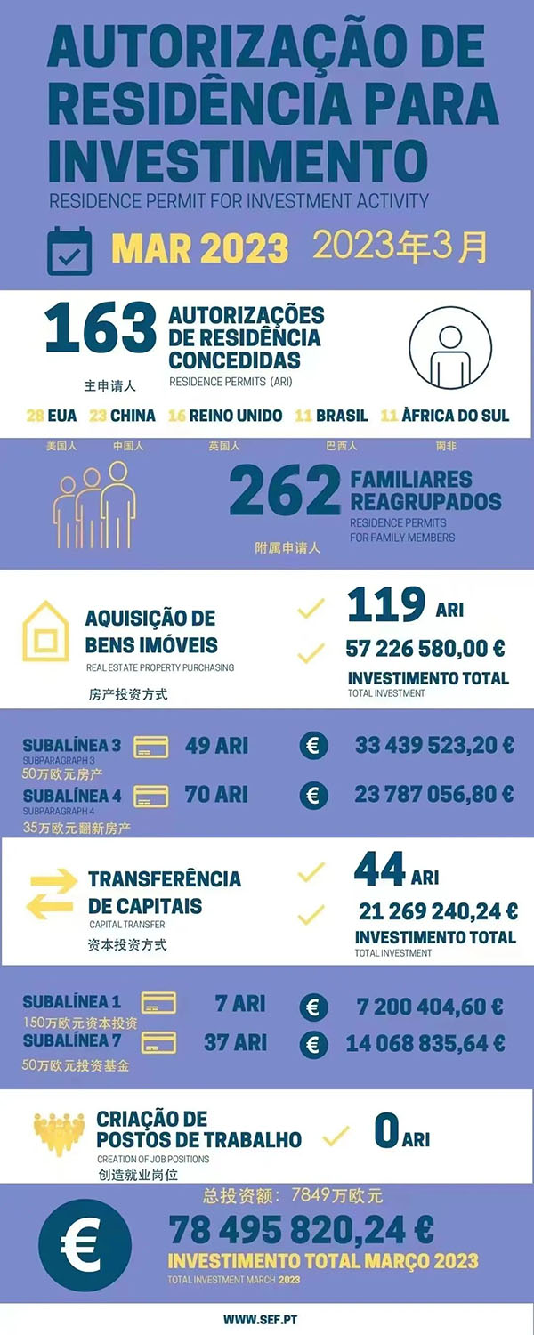 葡萄牙移民局(SEF)公布了新的黄金签证数据:2023年3月共有163位主申请人和262位附属申请人获批葡萄牙黄金签证。其中,来自中国的主申请人为23人,在申请人国家中排在第二。美国再次拿回第一共有28人,其次是英国16人、巴西11人、南非11人。