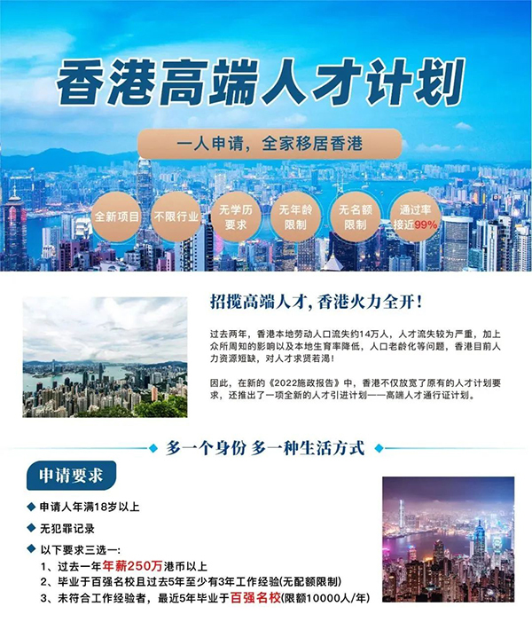 无法通过优才办理香港身份的朋友,可以首先考虑香港高才通A类计划。年薪达到250万港币或等值外币(递交申请前12个月),不论学历,申请不受限额。只要你能赚钱,在申请前一年,全年收入达港币250万元或以上(或等值外币)的人士,无论是什么大学毕业、从事什么行业,也不管学历高低、年龄大小,统统可以申请香港身份。比如在2023年申请,那么2022年的年薪要达到250万港币,如果是2022年未达标,但是2021年或2020年达标,都是不能是申请的。全年收入是指应课税的就业或业务收入包括薪金、津贴、股票期权及从其拥有的公司所得的利润,个人投资收入是不包含在内的。另外,高才通还有B\C类可供选择,如有名校学历,却因工作经验过少无法申请优才,特别适合以下两类。B类:在紧接申请前五年内获全球百强大学颁授学士学位,但工作经验少于三年的人士;这类申请受年度配额限制(10000个),且以先到先得的方式分配。C类:全球百强名校学士学位(申请人百强名校毕业,低于3年工作经验)。如果不确定自己是否满足申请条件,能否申请香港高才通,可以联系澳德华:400-700-8633 / 0755-88265668。 再退一步来讲,年收入250万也并非个小数目,如果既走不通优才,也不符合高才通申请要求,还有没有其他方法拿香港身份?香港留学也称香港进修移民,是业内公认门槛相对较低的申请方式。没有年龄限制要求,拥有内地或海外同等专业的学士学位即可申请。一人读一年制硕士,全家都能跟着拿香港身份,在读期间也计算进“满7年转永居”的时间内,首次就能获得两年逗留签证,即IANG签证。香港身份在教育、医疗、税务方面的巨大优势是公认的,大家也都希望能拿到第二身份作保障,建议大家不要盲目跟风,只申请香港优才,要根据个人条件选择最合适的方式。香港作为国际化大都市,国际教育起步早,发展成熟,也出现了一批知名的国际学校。除此之外,香港永久居民的后代,有机会享受“华侨生联考”的待遇,以较低的分数入读清华、北大等内地优质院校。在世界医疗水平上,香港的医疗水平仅次于美国,在个别领域更在欧美之上,如治愈胃癌和肺癌的水平位于世界前列,很多药相对便宜许多。拿到香港永居之后,以及你的配偶,子女都可以作为附属申请人申请移民香港,7年之后转永居,就是香港永久居民了。截至目前,香港特别行政区护照持有人免签证或落地签证入境旅游的国家和地区已增至170多个左右。除此之外,香港税制简单税务低廉,到手相比变得更多无全球征税,而且只有在香港赚取的收入才需要缴税,无遗产税、无赠与税,适合资产规划配置。免责申明:本文由小编综合整理,内容及图片版权均归原作者所有。若未能找到文章或图片出处,望谅解。如果有侵权行为,请与本账号联系,我们会在第一时间申明原文作者或者将侵权文章或图片删除,谢谢!